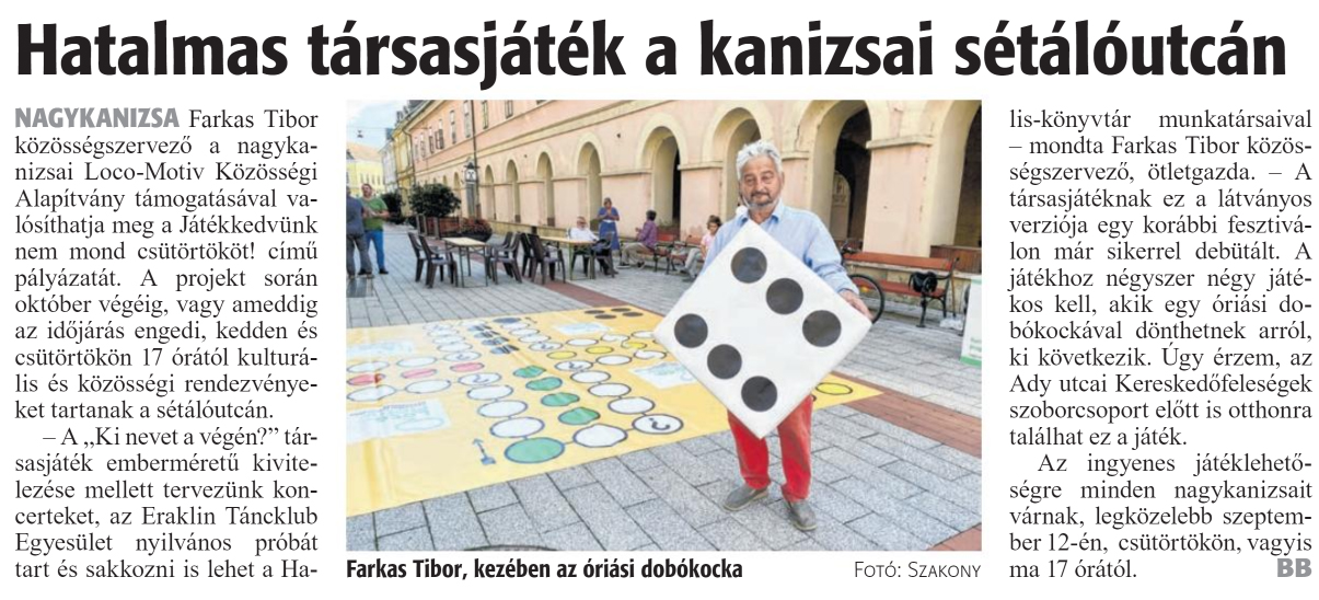 Nyilvános 858 | 1112 | Zalai Hírlap 2024. szeptember 12. 213. szám 6. oldal | Hatalmas társasjáték a kanizsai sétálóutcán NAGYKANIZSA Farkas Tibor közösségszervező a nagykanizsai Loco-Motiv Közösségi Alapítvány támogatásával valósíthatja meg a Játékkedvünk nem mond csütörtököt! című pályázatát. A projekt során október végéig, vagy ameddig az időjárás engedi, kedden és csütörtökön 17 órától kulturális és közösségi rendezvényeket tartanak a sétálóutcán. - A ,,Ki nevet a végén?" társasjáték emberméretü kivitelezése mellett tervezünk koncerteket, az Eraklin Táncklub Egyesület nyilvános próbát tart és sakkozni is lehet a Halis-könyvtár munkatársaival - mondta Farkas Tibor közösségszervező, ötletgazda. - A társasjátéknak ez a látványos verziója egy korábbi fesztiválon már sikerrel debütált. A játékhoz négyszer négy játékos kell, akik egy óriási dobókockával dönthetnek arról, ki következik. Ugy érzem, az Ady utcai Kereskedőfeleségek szoborcsoport előtt is otthonra találhat ez a játék. Az ingyenes játéklehetőségre minden nagykanizsait várnak, legközelebb szeptember 12-én, csütörtökön, vagyis ma 17 órától. BB Farkas Tibor, kezében az óriási dobókocka Fotó: Szakony |