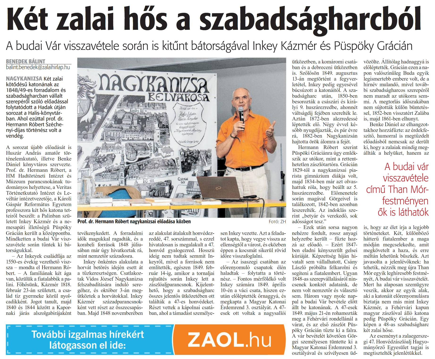 Nyilvános 775 | 977 | Zalai Hírlap 2024. október 21. 246. szám 5. oldal | Két zalai hős a szabadságharcból A budai Vár visszavétele során is kitűnt bátorságával Inkey Kázmér és Püspöky Grácián BENEDEK BÁLINT balint.benedek@zalaihirlap.hu NAGYKANIZSA Két zalai kötődésű katonának az 1848/49-es forradalom és szabadságharcban vállalt szerepéről szóló előadással folytatódott a Hadak útján sorozat a Halis-könyvtárban. Ahol ezúttal prof. dr. Hermann Róbert Széchenyi-díjas történész volt a vendég. A sorozat újabb előadását is Huszár András amatőr történelemkutató, illetve Benke Dániel könyvtáros szervezte. Prof. dr. Hermann Róbert, a HM Hadtörténeti Intézet és Múzeum parancsnokának tudományos helyettese, a Veritas Történetkutató Intézet és Levéltár intézetvezetője, a Károli Gáspár Református Egyetem professzora két hős katona tetteiről beszélt: a Palinban született Inkey Kázmér és a nemesapáti illetőségű Püspöky Grácián került a középpontba. Mindketten a budai Vár visszavétele során tűntek ki bátorságukkal. - Az Inkeyek családfája az 1550-es évekig vezethető vissza - mondta el Hermann Róbert. - A famíliának két ága van, közülük a fiatalabbik a palini. Főhősünk, Kázmér 1818. február 23-án született, a család tíz gyermeke közül nyolcadikként. Jogot tanult, majd 1840 és 1844 között a Kapornaki járás alszolgabírájaként tevékenykedett. A forradalmi idők magukkal ragadták, és a korabeli források 1848 júliusában már úgy hivatkoztak rá, mint nemzetőr századosra. Inkey önkéntes alakulata a horvát betörés idején esett át a tűzkeresztségen. Csatlakoztak Vidos József Nagykanizsa felszabadítására induló seregéhez, és október 3-án megütköztek a horvátokkal. Inkey Kázmér századparancsnokként vett részt az összecsapásban. Majd 1848 novemberében az alakulat átalakult honvédezreddé, 47. sorszámmal, s ezzel hivatalosan is megalakult a 47. honvéd gyalogezred. Hosszú ideig nem tudtak semmit Inkeyről, mivel a források nem említették, egészen 1849. február 14-ig, amikor a tornaijai rajtaütés során Inkey lett a zászlóaljparancsnok. Kijelenthető, hogy a szabadságharc összes jelentős ütközetében ott találták a 47-es honvédeket. Részt vettek a kápolnai csatában, ahol a támadást személyesen Inkey vezette. Azt a feladatot kapta, hogy vegye vissza az ellenségtől a várost, és eközben éppen a kocsmát sikerül rövid időre visszafoglalni. - Az isaszegi csatában az előrenyomuló csapatok élén haladtak - folytatta a történész. - Fontos mérföldkő volt Inkey számára 1849. április 10-én a váci csata, hiszen ezután előléptették őrnaggyá, és megkapta a Magyar Katonai Érdemrend 3. osztályát. A 47-esek ott voltak a nagysallói ütközetben, a komáromi csatában és a debreceni ütközetben is. Szőlősön 1849. augusztus 13-án megtörtént a fegyverletétel, Inkey pedig egyesével búcsúzott a katonáitól. A szabadságharc után, 1850-ben besorozták a császári és királyi 9. huszárezredbe, ahonnét váltságdíj fejében szerelték le. Aztán 1872-ben alezredessé léptették elő. Négy évvel később nyugdíjazták, és pár évre rá, 1882-ben Nagykanizsán hajtotta örök álomra a fejét. Hermann Róbert szerint Püspöki Gráciánra úgy emlékszik az utókor, mint a rettenthetetlen zászlótartóra. Grácián 1829-től a nagykanizsai piarista gimnázium diákja volt, majd 1834-ben már azt olvashattuk róla, hogy beállt az 5. huszárezredbe. Előmenetele során magával Görgeivel is találkozott, 1842-ben azonban leszerelték. Az indoklás szerint „betyár és verekedő, sok adósságot tesz." - Ezek után sorsa nagyon nehézre fordult, rossz anyagi helyzetbe került - fűzte hozzá az előadó. - Ezért 1847-ben eladni kényszerült gelsei kúriáját. Képzettség híján hivatalt sem vállalhatott, Csány László próbálta felkarolni és segíteni a fiatalembert. Ugyan 1848-as szerepvállalásáról nincsenek konkrét adataink, de nem volt nemzetőr és választó sem. Három vagy nyolc nappal a budai Vár bevétele előtt állt be katonának. A 47-esek 1849. május 21-én rohamozták meg a Fehérvári rondellánál a várat, és az első zászlót Püspöky Grácián tűzte ki a falra. A vár bevételét követően Gör-gei személyesen tüntette ki a Magyar Katonai Érdemrend 3. osztályával és szívélyesen üdvözölte. Állítólag hadnaggyá is előléptették. Grácián ezen a napon valószínűleg Buda egyik legismertebb embere volt, de a hírnév mulandó, mivel további szabadságharcos szerepéről nem maradt az utókorra semmi. A megtorlás időszakában nem sújtották külön büntetéssel, 1852-ben visszatért Zalába is, majd 1861-ben elhunyt. Benke Dániel az elhangzottakhoz hozzáfűzte: az érdekfeszítő, humorral is megtűzdelt előadásból nemcsak az derült ki, hogy a zalaiak mindig megállták a helyüket, hanem az is, hogy az élet írja a legjobb történeteket. Két, különböző hátterű fiatalember a maga módján megcselekedte, amit megkövetelt a haza, és erre méltán lehetünk büszkék. Azt javasolta a jelenlévőknek: ha tehetik, nézzék meg újra Than Mór egyik leghíresebb festményét, A budai vár visszavételét. Mert ha alaposan szemügyre veszik, akkor az egyik alak, aki a katonáit előrenyomulásra biztatja nem más mint Inkey Kázmér, a Fehérvári kapun magyar zászlóval álló katona pedig Püspöky Grácián. Egy képen a 48-as szabadságharc két zalai hőse. Az eseményt a zalaegerszegi 47. Honvédzászlóalj Hagyományőrző Egyesület tagjai is megtisztelték jelenlétükkel. |