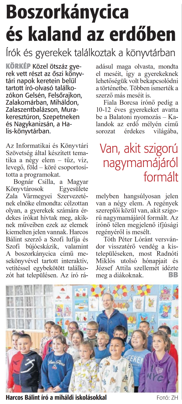 Nyilvános 774 | 942 | Zalai Hírlap 2024. október 31. 254. szám 6. oldal | Boszorkánycica és kaland az erdőben írók és gyerekek találkoztak a könyvtárban KÖRKÉP Közel ötszáz gyerek vett részt az őszi könyvtári napok keretein belül tartott író-olvasó találkozókon Gelsén, Felsőrajkon, Zalakomárban, Miháldon, Zalaszentbalázson, Murakeresztúron, Szepetneken és Nagykanizsán, a Halis-könyvtárban. Az Informatikai és Könyvtári Szövetség által készített tematika a négy elem - tüz, víz, levegő, föld - köré csoportosította a programokat. Bognár Csilla, a Magyar Könyvtárosok Egyesülete Zala Vármegyei Szervezetének elnöke elmondta: célzottan olyan, a gyerekek számára érdekes írókat hívtak meg, akiknek műveiben ezek az elemek kiemelten jelen vannak. Harcos Bálint szerző a Szofi lufija és Szofi bújócskázik, valamint A boszorkánycica című mesekönyvével tartott interaktív, vetítéssel egybekötött találkozót hat településen. Az író rá- adásul maga olvasta, mondta el meséit, így a gyerekeknek lehetőségük volt bekapcsolódni a történetbe. Többen ismerték a szerző más meséit is. Fiala Borcsa írónő pedig a 10-12 éves gyerekeket avatta be a Balatoni nyomozás - Kalandok az erdő mélyén című sorozat érdekes világába, melyben hangsúlyosan jelen van a négy elem. A regények szereplői közül van, akit szigorú nagymamájáról formált. Az írónő télen megjelenő ifjúsági regényéről is mesélt. Tóth Péter Lóránt versvándor visszatérő vendég a kistelepüléseken, most Radnóti Miklós utolsó hónapjait és József Attila szellemét idézte meg a diákoknak. BB Harcos Bálint író a miháldi iskolásokkal Fotó: ZH |