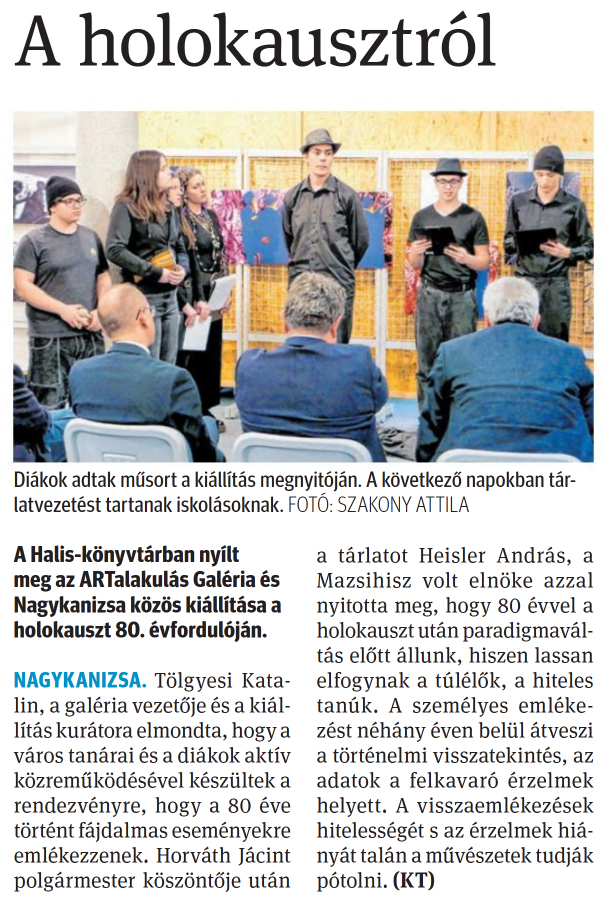 Nyilvános 705 | 1190 | Zalai Hírlap 2025. április 2. 77. szám 1. oldal | A holokausztról A Halis-könyvtárban nyílt meg az ARTalakulás Galéria és Nagykanizsa közös kiállítása a holokauszt 80. évfordulóján. NAGYKANIZSA. Tölgyesi Katalin, a galéria vezetője és a kiállítás kurátora elmondta, hogy a város tanárai és a diákok aktív közreműködésével készültek a rendezvényre, hogy a 80 éve történt fájdalmas eseményekre emlékezzenek. Horváth Jácint polgármester köszöntője után a tárlatot Heisler András, a Mazsihisz volt elnöke azzal nyitotta meg, hogy 80 évvel a holokauszt után paradigmaváltás előtt állunk, hiszen lassan elfogynak a túlélők, a hiteles tanúk. A személyes emlékezést néhány éven belül átveszi a történelmi visszatekintés, az adatok a felkavaró érzelmek helyett. A visszaemlékezések hitelességét s az érzelmek hiányát talán a művészetek tudják pótolni. (KT) Diákok adtak műsort a kiállítás megnyitóján. A következő napokban tárlatvezetést tartanak iskolásoknak. FOTÓ: SZAKONY ATTILA |