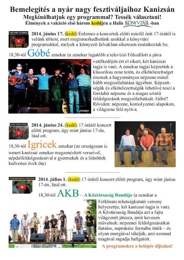 Nyilvános 1289 | 3015 | Bemelegítés a nyár nagy fesztiváljaihoz Kanizsán | Megkínálhatjuk egy programmal? Tessék választani! Élmények a vakáció első három keddjén a Halis könyvtárban 2014. június 17. (kedd) Érdemes a koncertek előtti másfél órát 17 órától is velünk tölteni, mert megismerkedhetünk azokkal a könyvtári programokkal, melyek a környező falvakban sikeresen mutatkoztak be. 18,30-tól Góbé zenekar (a zenekar legutóbb a televízió Fölszállott a páva vetélkedőjén ért el sikert, két kanizsai tagja is van). A zenekar tagjai képzettek a klasszikus zene terén, és elkötelezettséget éreznek a hagyományos népzene minél hűbb megszólaltatása ügyében. Képzett-ségük és elkötelezettségük lehetővé teszi a forráshű népzene és a magas szintű feldolgozások megszólaltatását. Góbé? Röviden: népzene, komolyzenei alapokon, a világzene felé nyitva. 2014. június 24. (kedd) 17 órától koncert előtti program, úgy mint június 17-én, lásd ott. 18,30-tól Igricek zenekar (az országosan is ismert kanizsai zenekar megzenésített verseivel, népdalfeldolgozásaival a gyermekek és a felnőttek kedvence évek óta) 2014. július 1. (kedd) 17 órától koncert előtti program, úgy mint június 17-én, lásd ott. 18,30-tól AKB – A Köztársaság Bandája (a zenekar a Folkbeats tehetségkutató verseny helyezettje, két kanizsai tagja is van). A Köztársaság Bandája azt a fajta világzenét játssza, amit kevesen művelnek: népzenei feldolgozásaikat fiatalos, naprakész formába öntik – és olyan energiával tálalják, ami azonnal magával ragadja hallgatóit. A programokra a belépés díjtalan! |