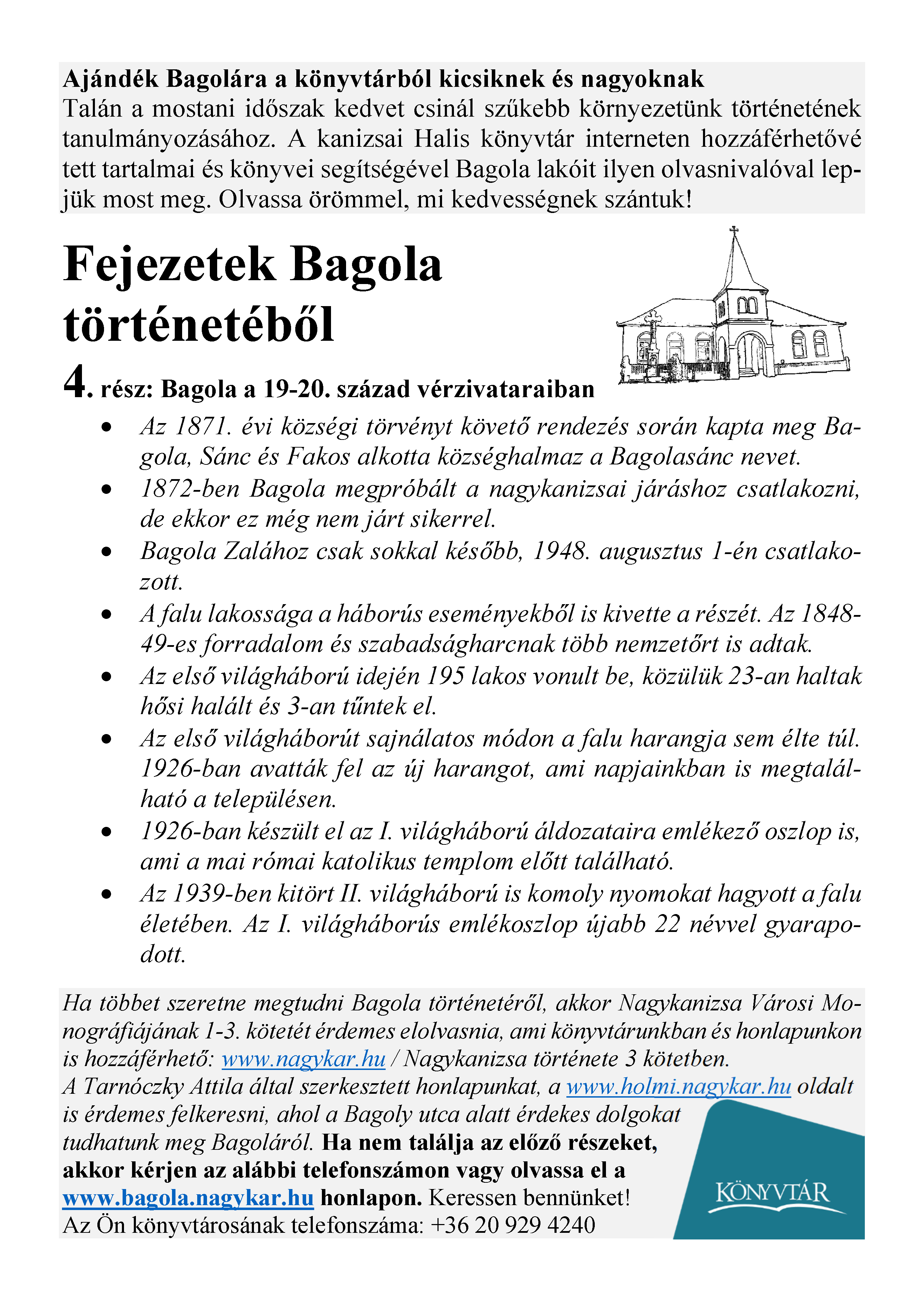 Nyilvános 1570 | 2405 | Megjelenés: 2021. május 7. | Ajándék Bagolára a könyvtárból kicsiknek és nagyoknak Talán a mostani időszak kedvet csinál szűkebb környezetünk történetének tanulmányozásához. A kanizsai Halis könyvtár interneten hozzáférhetővé tett tartalmai és könyvei segítségével Bagola lakóit ilyen olvasnivalóval lepjük most meg. Olvassa örömmel, mi kedvességnek szántuk! Fejezetek Bagola történetéből 4. rész: Bagola a 19-20. század vérzivataraiban • Az 1871. évi községi törvényt követő rendezés során kapta meg Bagola, Sánc és Fakos alkotta községhalmaz a Bagolasánc nevet. • 1872-ben Bagola megpróbált a nagykanizsai járáshoz csatlakozni, de ekkor ez még nem járt sikerrel. • Bagola Zalához csak sokkal később, 1948. augusztus 1-én csatlakozott. • A falu lakossága a háborús eseményekből is kivette a részét. Az 1848-49-es forradalom és szabadságharcnak több nemzetőrt is adtak. • Az első világháború idején 195 lakos vonult be, közülük 23-an haltak hősi halált és 3-an tűntek el. • Az első világháborút sajnálatos módon a falu harangja sem élte túl. 1926-ban avatták fel az új harangot, ami napjainkban is megtalálható a településen. • 1926-ban készült el az I. világháború áldozataira emlékező oszlop is, ami a mai római katolikus templom előtt található. • Az 1939-ben kitört II. világháború is komoly nyomokat hagyott a falu életében. Az I. világháborús emlékoszlop újabb 22 névvel gyarapodott. Ha többet szeretne megtudni Bagola történetéről, akkor Nagykanizsa Városi Monográfiájának 1-3. kötetét érdemes elolvasnia, ami könyvtárunkban és honlapunkon is hozzáférhető: www.nagykar.hu / Nagykanizsa története 3 kötetben. A Tarnóczky Attila által szerkesztett honlapunkat, a www.holmi.nagykar.hu oldalt is érdemes felkeresni, ahol a Bagoly utca alatt érdekes dolgokat tudhatunk meg Bagoláról. Ha nem találja az előző részeket, akkor kérjen az alábbi telefonszámon vagy olvassa el a www.bagola.nagykar.hu honlapon. Keressen bennünket! Az Ön könyvtárosának telefonszáma: +36 20 929 4240 |