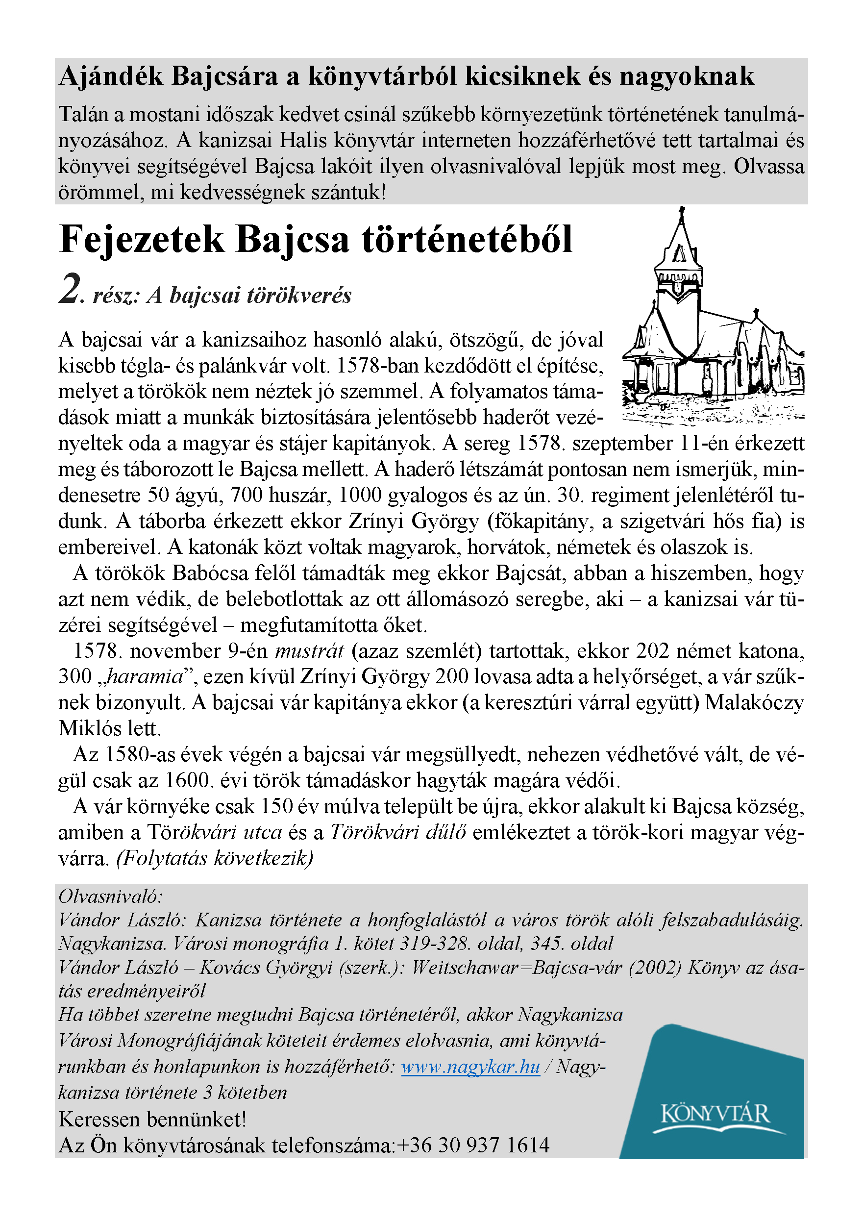 Nyilvános 1688 | 2895 | Megjelent: 2021. április 9. | Ajándék Bajcsára a könyvtárból kicsiknek és nagyoknak Talán a mostani időszak kedvet csinál szűkebb környezetünk történetének tanulmányozásához. A kanizsai Halis könyvtár interneten hozzáférhetővé tett tartalmai és könyvei segítségével Bajcsa lakóit ilyen olvasnivalóval lepjük most meg. Olvassa örömmel, mi kedvességnek szántuk! Fejezetek Bajcsa történetéből 2. rész: A bajcsai törökverés A bajcsai vár a kanizsaihoz hasonló alakú, ötszögű, de jóval kisebb tégla- és palánkvár volt. 1578-ban kezdődött el építése, melyet a törökök nem néztek jó szemmel. A folyamatos támadások miatt a munkák biztosítására jelentősebb haderőt vezényeltek oda a magyar és stájer kapitányok. A sereg 1578. szeptember 11-én érkezett meg és táborozott le Bajcsa mellett. A haderő létszámát pontosan nem ismerjük, mindenesetre 50 ágyú, 700 huszár, 1000 gyalogos és az ún. 30. regiment jelenlétéről tudunk. A táborba érkezett ekkor Zrínyi György (főkapitány, a szigetvári hős fia) is embereivel. A katonák közt voltak magyarok, horvátok, németek és olaszok is. A törökök Babócsa felől támadták meg ekkor Bajcsát, abban a hiszemben, hogy azt nem védik, de belebotlottak az ott állomásozó seregbe, aki – a kanizsai vár tüzérei segítségével – megfutamította őket. 1578. november 9-én mustrát (azaz szemlét) tartottak, ekkor 202 német katona, 300 „haramia”, ezen kívül Zrínyi György 200 lovasa adta a helyőrséget, a vár szűknek bizonyult. A bajcsai vár kapitánya ekkor (a keresztúri várral együtt) Malakóczy Miklós lett. Az 1580-as évek végén a bajcsai vár megsüllyedt, nehezen védhetővé vált, de végül csak az 1600. évi török támadáskor hagyták magára védői. A vár környéke csak 150 év múlva települt be újra, ekkor alakult ki Bajcsa község, amiben a Törökvári utca és a Törökvári dűlő emlékeztet a török-kori magyar végvárra. (Folytatás következik) Olvasnivaló: Vándor László: Kanizsa története a honfoglalástól a város török alóli felszabadulásáig. Nagykanizsa. Városi monográfia 1. kötet 319-328. oldal, 345. oldal Vándor László – Kovács Györgyi (szerk.): Weitschawar=Bajcsa-vár (2002) Könyv az ásatás eredményeiről Ha többet szeretne megtudni Bajcsa történetéről, akkor Nagykanizsa Városi Monográfiájának köteteit érdemes elolvasnia, ami könyvtá- runkban és honlapunkon is hozzáférhető: www.nagykar.hu / Nagy- kanizsa története 3 kötetben Keressen bennünket! |