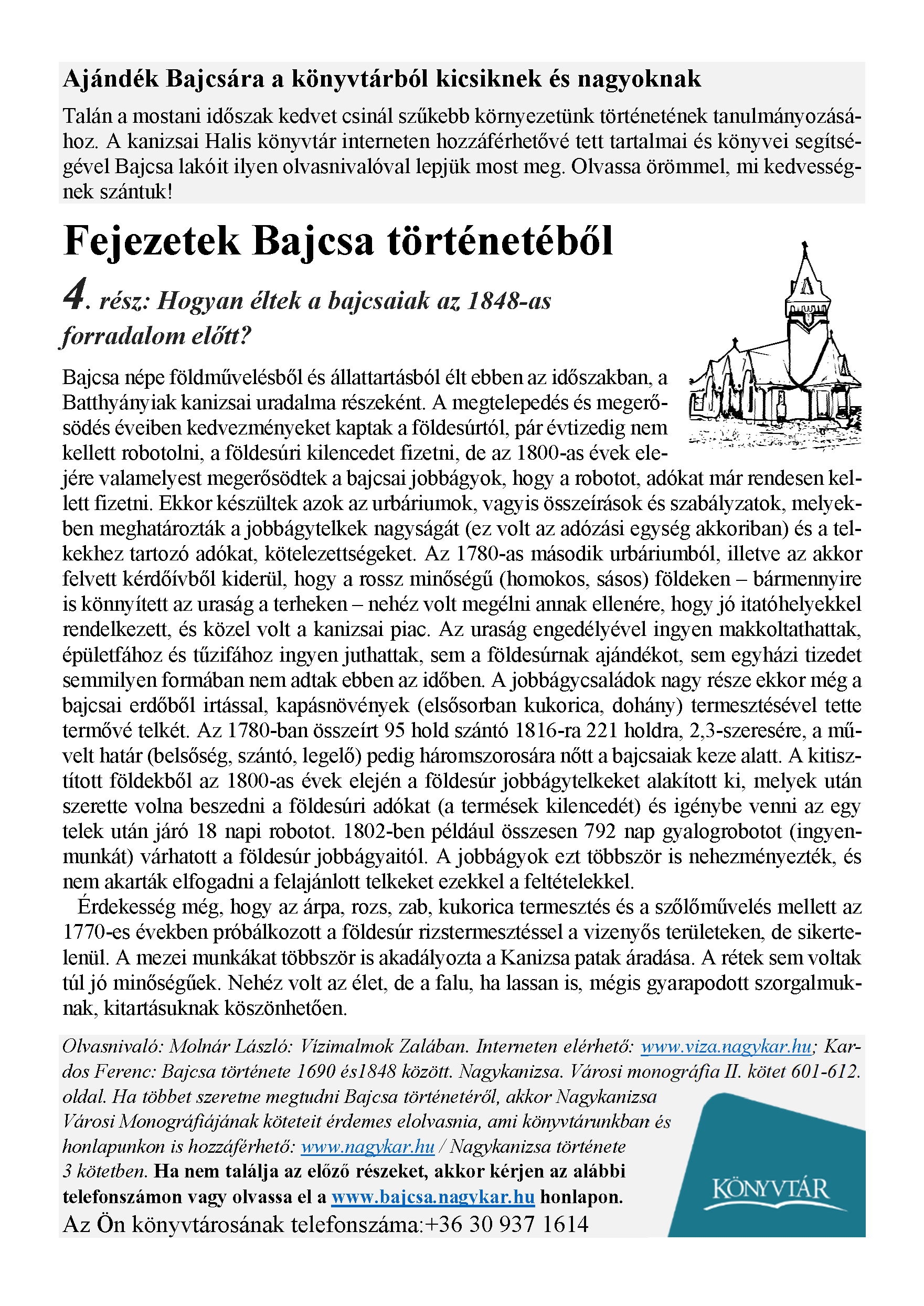 Nyilvános 1691 | 2986 | Megjelenés: 2021. május 7. | Ajándék Bajcsára a könyvtárból kicsiknek és nagyoknak Talán a mostani időszak kedvet csinál szűkebb környezetünk történetének tanulmányozásához. A kanizsai Halis könyvtár interneten hozzáférhetővé tett tartalmai és könyvei segítségével Bajcsa lakóit ilyen olvasnivalóval lepjük most meg. Olvassa örömmel, mi kedvességnek szántuk! Fejezetek Bajcsa történetéből 4. rész: Hogyan éltek a bajcsaiak az 1848-as forradalom előtt? Bajcsa népe földművelésből és állattartásból élt ebben az időszakban, a Batthyányiak kanizsai uradalma részeként. A megtelepedés és megerősödés éveiben kedvezményeket kaptak a földesúrtól, pár évtizedig nem kellett robotolni, a földesúri kilencedet fizetni, de az 1800-as évek elejére valamelyest megerősödtek a bajcsai jobbágyok, hogy a robotot, adókat már rendesen kellett fizetni. Ekkor készültek azok az urbáriumok, vagyis összeírások és szabályzatok, melyekben meghatározták a jobbágytelkek nagyságát (ez volt az adózási egység akkoriban) és a telkekhez tartozó adókat, kötelezettségeket. Az 1780-as második urbáriumból, illetve az akkor felvett kérdőívből kiderül, hogy a rossz minőségű (homokos, sásos) földeken – bármennyire is könnyített az uraság a terheken – nehéz volt megélni annak ellenére, hogy jó itatóhelyekkel rendelkezett, és közel volt a kanizsai piac. Az uraság engedélyével ingyen makkoltathattak, épületfához és tűzifához ingyen juthattak, sem a földesúrnak ajándékot, sem egyházi tizedet semmilyen formában nem adtak ebben az időben. A jobbágycsaládok nagy része ekkor még a bajcsai erdőből irtással, kapásnövények (elsősorban kukorica, dohány) termesztésével tette termővé telkét. Az 1780-ban összeírt 95 hold szántó 1816-ra 221 holdra, 2,3-szeresére, a művelt határ (belsőség, szántó, legelő) pedig háromszorosára nőtt a bajcsaiak keze alatt. A kitisztított földekből az 1800-as évek elején a földesúr jobbágytelkeket alakított ki, melyek után szerette volna beszedni a földesúri adókat (a termések kilencedét) és igénybe venni az egy telek után járó 18 napi robotot. 1802-ben például összesen 792 nap gyalogrobotot (ingyenmunkát) várhatott a földesúr jobbágyaitól. A jobbágyok ezt többször is nehezményezték, és nem akarták elfogadni a felajánlott telkeket ezekkel a feltételekkel. Érdekesség még, hogy az árpa, rozs, zab, kukorica termesztés és a szőlőművelés mellett az 1770-es években próbálkozott a földesúr rizstermesztéssel a vizenyős területeken, de sikertelenül. A mezei munkákat többször is akadályozta a Kanizsa patak áradása. A rétek sem voltak túl jó minőségűek. Nehéz volt az élet, de a falu, ha lassan is, mégis gyarapodott szorgalmuknak, kitartásuknak köszönhetően. Olvasnivaló: Molnár László: Vízimalmok Zalában. Interneten elérhető: www.viza.nagykar.hu; Kardos Ferenc: Bajcsa története 1690 és1848 között. Nagykanizsa. Városi monográfia II. kötet 601-612. oldal. Ha többet szeretne megtudni Bajcsa történetéről, akkor Nagykanizsa Városi Monográfiájának köteteit érdemes elolvasnia, ami könyvtárunkban és honlapunkon is hozzáférhető: www.nagykar.hu / Nagykanizsa története 3 kötetben. Ha nem találja az előző részeket, akkor kérjen az alábbi telefonszámon vagy olvassa el a www.bajcsa.nagykar.hu honlapon. Az Ön könyvtárosának telefonszáma:+36 30 937 1614 |