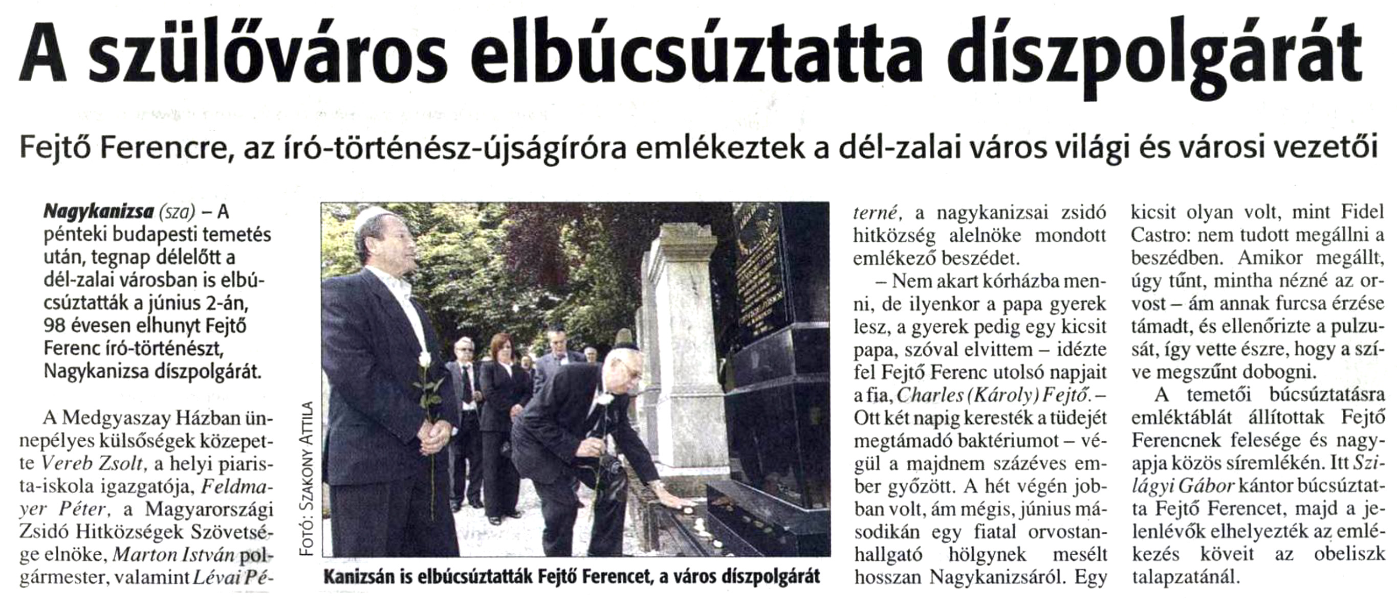 Nyilvános 884 | 1206 | Zalai Hírlap 2008. június 16. 3. oldal | A szülőváros elbúcsúztatta díszpolgárát Fejtő Ferencre, az író-történész-újságíróra emlékeztek a dél-zalai város világi és városi vezetői Nagykanizsa (sza) - A pénteki budapesti temetés után, tegnap délelőtt a dél-zalai városban is elbúcsúztatták a június 2-án, 98 évesen elhunyt Fejtő Ferenc író-történészt, Nagykanizsa díszpolgárát. A Medgyaszay Házban ünnepélyes külsőségek közepette Vereb Zsolt, a helyi piarista-iskola igazgatója, Feldmayer Péter, a Magyarországi Zsidó Hitközségek Szövetsége elnöke, Marton István polgármester, valamint Lévai Pétérné, a nagykanizsai zsidó hitközség alelnöke mondott emlékező beszédet. - Nem akart kórházba menni, de ilyenkor a papa gyerek lesz, a gyerek pedig egy kicsit papa, szóval elvittem - idézte fel Fejtő Ferenc utolsó napjait a fia, Charles (Károly) Fejtő. - Ott két napig keresték a tüdejét megtámadó baktériumot - végül a majdnem százéves ember győzött. A hét végén jobban volt, ám mégis, június másodikén egy fiatal orvostanhallgató hölgynek mesélt hosszan Nagykanizsáról. Egy kicsit olyan volt, mint Fidel Castro: nem tudott megállni a beszédben. Amikor megállt, úgy tűnt, mintha nézné az orvost - ám annak furcsa érzése támadt, és ellenőrizte a pulzusát, így vette észre, hogy a szíve megszűnt dobogni. A temetői búcsúztatásra emléktáblát állítottak Fejtő Ferencnek felesége és nagyapja közös síremlékén. Itt Szilágyi Gábor kántor búcsúztatta Fejtő Ferencet, majd a jelenlévők elhelyezték az emlékezés köveit az obeliszk talapzatánál. Kanizsán is elbúcsúztatták Fejtő Ferencet, a város díszpolgárát |