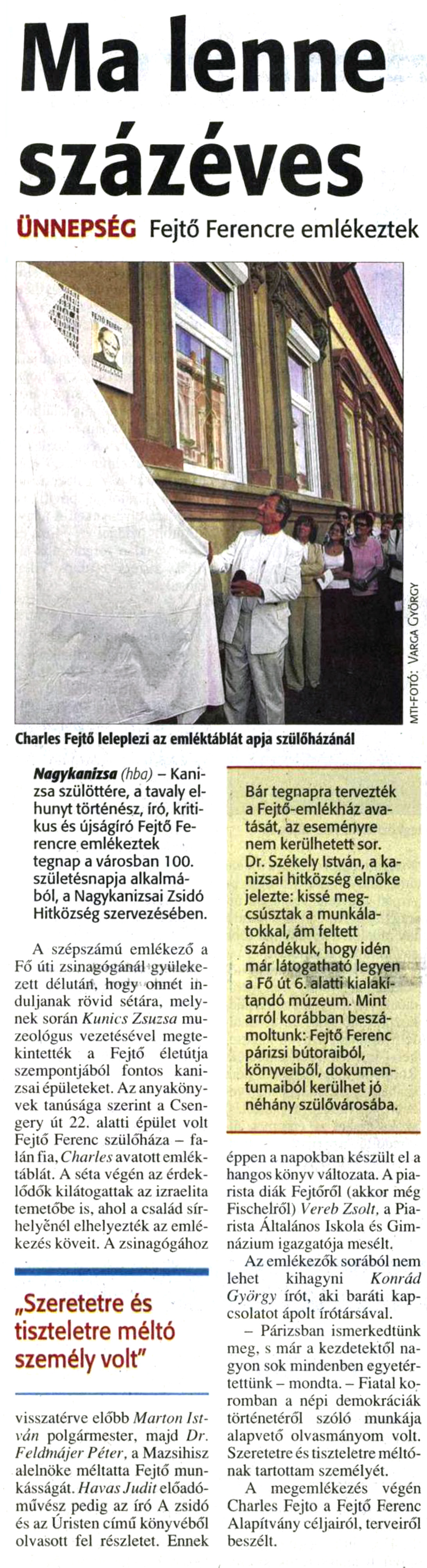 Nyilvános 904 | 1245 | Zalai Hírlap 2009. augusztus 31. 5. oldal | Ma lenne százéves ÜNNEPSÉG Fejtő Ferencre emlékeztek Bár tegnapra tervezték a Fejtő-emlékház avatását, az eseményre nem kerülhetett sor. Dr. Székely István, a kanizsai hitközség elnöke jelezte: kissé megcsúsztak a munkálatokkal, ám feltett szándékuk, hogy idén már látogatható legyen a Fő út 6. alatti kialakítandó múzeum. Mint arról korábban beszámoltunk: Fejtő Ferenc párizsi bútoraiból, könyveiből, dokumentumaiból kerülhet jó néhány szülővárosába. Nagykanizsa (hba) - Kanizsa szülöttére, a tavaly elhunyt történész, író, kritikus és újságíró Fejtő Ferencre emlékeztek tegnap a városban 100. születésnapja alkalmából, a Nagykanizsai Zsidó Hitközség szervezésében. A szépszámú emlékező a Fő úti zsinagógánál gyülekezett délutárí, hogy onnét induljanak rövid sétára, melynek során Kunics Zsuzsa muzeológus vezetésével megtekintették a Fejtő életútja szempontjából fontos kanizsai épületeket. Az anyakönyvek tanúsága szerint a Csen- gery út 22. alatti épület volt Fejtő Ferenc szülőháza - falán fia, Charles avatott emléktáblát. A séta végén az érdeklődők kilátogattak az izraelita temetőbe is, ahol a család sírhelyénél elhelyezték az emlékezés köveit. A zsinagógához visszatérve előbb Marton István polgármester, majd Dr. Feldtnájer Péter, a Mazsihisz alelnöke méltatta Fejtő munkásságát. Havas Judité lőadó- művész pedig az író A zsidó és az Úristen című könyvéből olvasott fel részletet. Ennek éppen a napokban készült el a hangos könyv változata. A piarista diák Fejtőről (akkor még Fischelről) Vereb Zsolt, a Piarista Általános Iskola és Gimnázium igazgatója mesélt. Az emlékezők sorából nem lehet kihagyni Konrád György írót, aki baráti kapcsolatot ápolt írótársával. - Párizsban ismerkedtünk meg, s már a kezdetektől nagyon sok mindenben egyetértettünk- mondta. - Fiatal koromban a népi demokráciák történetéről szóló munkája alapvető olvasmányom volt. Szeretetre és tiszteletre méltónak tartottam személyét. A megemlékezés végén Charles Fejtő a Fejtő Ferenc Alapítvány céljairól, terveiről beszélt. Charles Fejtő leleplezi az emléktáblát apja szülőházánál |